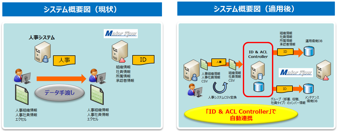 これまで社内業務で利用されるワークフローシステムなどにおいて、本格的ID管理システムの導入がコスト面や規模感により難しい場合、 企業のシステム管理者は人事システムの情報から各システムに対して社員情報や組織情報をExcelなどで加工・修正作業を介してインポートする「データ手渡し」が必要でした。 企業において定期作業ともいえるこれら更新作業は期毎に確実に更新されなければならず、連携システム数によっては管理者に多くの運用負担が発生してしまいます。(異動の対象社員の振り分けのみならず、 組織そのものが更新される場合など、管理者は各連携システムに合わせ細かにメンテナンスを実施する必要があります。)そのため、実状としてはユーザー、組織メンテナスが速やかにシステムに反映できなかったり、 管理者によるオペレーションミスが発生したりするデメリットも存在しました。アクシオはこうした管理者への負担を軽減すべく、企業が比較的容易に導入が可能な「ID & ACL Controller For MajorFlow」を2016年12月より販売開始致します。